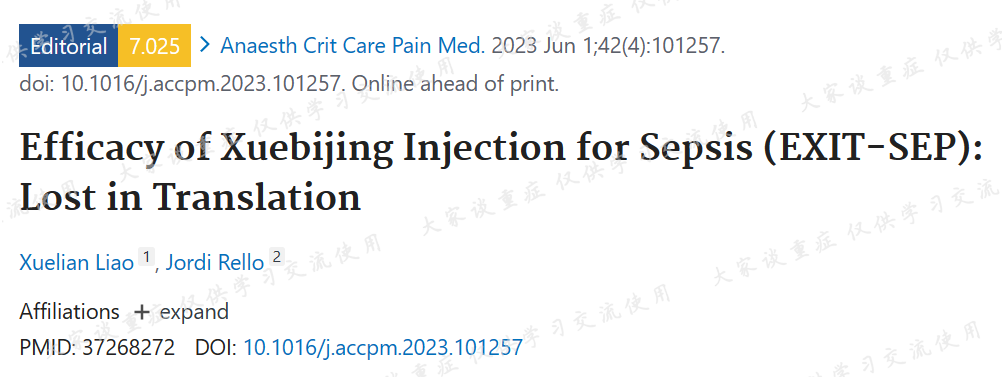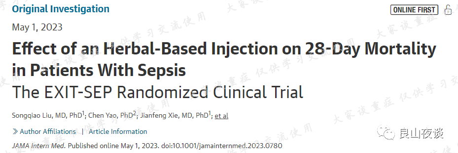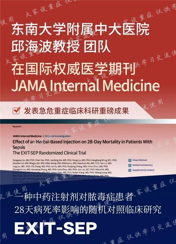 脓毒症治疗一直都是存在着挑战,从早期发现、识别,到启动治疗、阶段调整及评估预后,基于其异质性的存在,也基于不同医疗机构医疗水平的差异性,脓毒症的治疗效果一直都是差强人意。中医药治疗,尤其是中药制剂的治疗,在简便性方面不逊于传统意义的现代医学制剂治疗,突破了传统中药的汤药形式,解决了经口服用、经胃肠道吸收在部分患者身上的局限性问题。但是,对于中药制剂的静脉应用,其疗效及安全性方面,一直受到广泛关注,尤其是某些制剂的安全性存在欠缺的现实,让很部分人对中药制剂产生了抗拒。作为医学领域的权威学术杂志之一,JAMA系列刊物Internal Medicine在今年5月发表了一篇由国人重症牛人邱海波教授团队主导的、多中心、随机对照试验结果,结果提示,对于脓毒症患者,静脉应用血必净(100ml、BID)5天,能够有效改善28d死亡率(7.3%)。本研究纳入的是18~75岁的、SOFA评分2~13分、入院启动血必净治疗不超过48小时的患者。primary outcome评估的是28d全因死亡率,key secondary outcomes包括ICU死亡率、院内死亡率、ICU和住院时长、28d内最长和最短ICU-free时间等。杂志同时还发表了一篇评述文章,Xuebijing Injection for the Treatment of SepsisWhat Would a Path to FDA Approval Look Like?( doi:10.1001/jamainternmed.2023.0788),评议了血必净可否获得FDA批准。文章对研究中的几个问题,一方面是血必净是中药制剂(herbal preparation)而非药物(drug),其实也是对中药制剂与化学提取物之间的差异进行了考究;另一方面,研究也是一个单一疗效研究;最后,还提出该研究是非美国国内的研究、而是仅在中国国内进行的研究。JAMA系列发表的article文章原文摘要如下:Importance Previous research has suggested that Xuebijing injection (XBJ), an herbal-based intravenous preparation, may reduce mortality among patients with sepsis.Objective To determine the effect of XBJ vs placebo on 28-day mortality among patients with sepsis.Design, Setting, and Participants The Efficacy of Xuebijing Injection in Patients With Sepsis (EXIT-SEP) trial was a multicenter, randomized double-blind, placebo-controlled trial conducted in intensive care units at 45 sites and included 1817 randomized patients with sepsis (sepsis 3.0) present for less than 48 hours. Patients aged 18 to 75 years with a Sequential Organ Failure Assessment score of 2 to 13 were enrolled. The study was conducted from October 2017 to June 2019. The final date of follow-up was July 26, 2019. Data analysis was performed from January 2020 to August 2022.Interventions The patients were randomized to receive either intravenous infusion of XBJ (100 mL, n = 911) or volume-matched saline placebo (n = 906) every 12 hours for 5 days.Main Outcomes and Measures The primary outcome was 28-day mortality.Results Among the 1817 patients who were randomized (mean [SD] age, 56.5 [13.5] years; 1199 [66.0%] men), 1760 (96.9%) completed the trial. In these patients, the 28-day mortality rate was significantly different between the placebo group and the XBJ group (230 of 882 patients [26.1%] vs 165 of 878 patients [18.8%], respectively; P