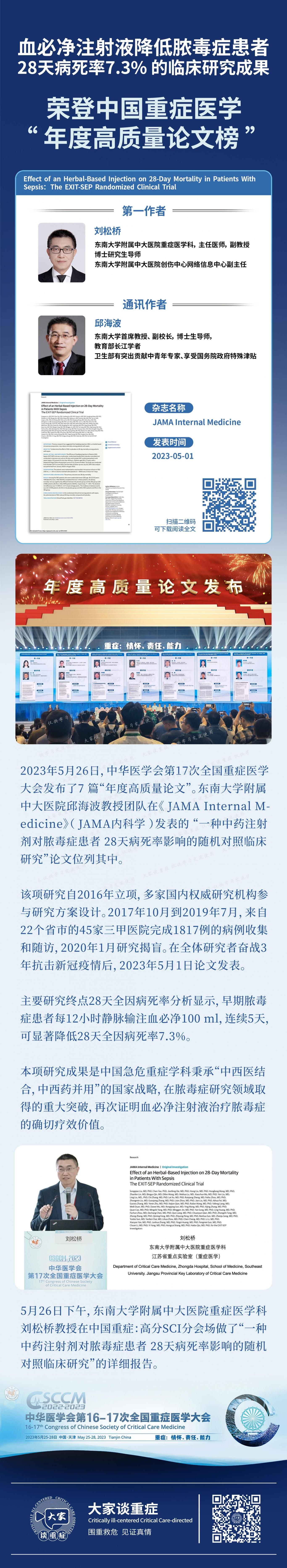 近日,东南大学附属中大医院重症医学科邱海波教授领导的研究团队,在国际权威期刊《JAMA Internal Medicine》(JAMA•内科学)发表了题为“一种中药注射剂对脓毒症患者28天病死率影响的随机对照临床研究”的结果。研究结果显示,红日药业拥有自主知识产权的核心产品血必净注射液能够显著降低脓毒症患者28天全因病死率7.3%,证明中医药治疗脓毒症等急危重症的疗效价值,提供了脓毒症治疗的中国方案。本次中西结合治疗脓毒症的循证研究在国际期刊发表,是中医药在国际学术领域的一次先锋探索。中国日报对此进行深度报道。在重症监护室(ICU)中,患者家属跟医生沟通病情的时候,可能会经常听见“脓毒症”这个诊断。很多人初次听到这个病,也许会感到陌生和好奇,难道患者“中毒”啦?但当详细了解之后,往往会惊出一身冷汗,因为脓毒症在ICU中较为常见,并且28天病死率大于30%。而时至今日,在全球范围内,脓毒症治疗的新药研发依然鲜有成效,是医学界公认的重大难题。为了让这一“中国方案”真正走出国门,挽救更多脓毒症患者的生命,造福人类社会,由东南大学附属中大医院邱海波教授领导的多学科团队,开展了一项持续近2年的大规模临床研究。该研究结果显示,中药注射剂血必净能够降低脓毒症患者28天全因病死率7.3%,这一研究成果最终获得国际学术界肯定,并在国际医学期刊《JAMA Internal Medicine》发表。目前,在改善脓毒症预后研究领域,全球范围内尚无其他药品被证实有效,这项研究成果的发表刷新了国际医学界的认知边界,是中医药走向世界的重大跨越。01这个中药注射剂背景“不简单”据了解,血必净注射液“师出名门”,处方源自清代《医林改错》中记载的知名古方。由红花、赤芍、川芎、丹参、当归组方而成,其传承中医经典理论,以君一臣二治急症,诸药配伍,共收活血祛瘀、疏通络脉、溃散毒邪之功。2004年,血必净作为中药二类新药获批上市,成为唯一获批以脓毒症为适应症的中药注射剂。因为在临床治疗中的突出表现和循证医学证据充分,曾获得由天津市科学技术局授予的“天津市科学技术进步一等奖”,以及中国中医药研究促进会科技进步一等奖等荣誉。从2010年开始,血必净注射液历时十余年循证研究,涉及呼吸、急诊、重症等多个学科,丰富了临床有效性和安全性的循证医学体系。厚积薄发取得的研究成果,也在不断转化为临床治疗指南和专家共识的推荐证据。02这篇治疗脓毒症的临床研究“分量足” 2023年5月,《JAMA Internal Medicine》发表了题为“一种中药注射剂对脓毒症患者28天病死率影响的随机对照临床研究”的论文,在中医、西医、中西医结合领域均产生重大反响,让中医药在国际学术圈再度引发热议。这项研究由邱海波教授发起,联合国内20余省市地区数十家科研机构及三甲医院的相关科室,聚焦该领域的核心研究目标“病死率”,采用国际通用的多中心、随机双盲对照研究方法开展,达到了国际权威同行的评议标准,这种“高力度”也得到了《JAMA Internal Medicine》期刊评审专家们的认可。研究结果显示,相比于安慰剂组,血必净组脓毒症患者28天全因病死率降低了7.3%,且在降低ICU病死率和住院病死率等方面效果明显,临床安全性可靠。一直以来,中药以及中西结合治疗方案在国际知名期刊上发表的研究成果“凤毛麟角”,取得突破或者领先的方案更是屈指可数,而在脓毒症这样的重大病种中获得学术认可则绝无仅有。本次中西结合治疗脓毒症的循证研究在国际期刊发表,是中医药在国际学术领域的一次先锋探索,更是一块“敲门砖”,将为后续更多“中国方案”开展循证医学研究、走向国际化带来启示,并为中国乃至世界的健康事业贡献更多的可能。- The End -转自成都兴城