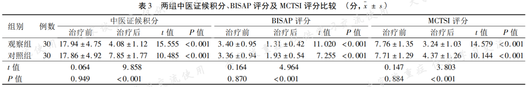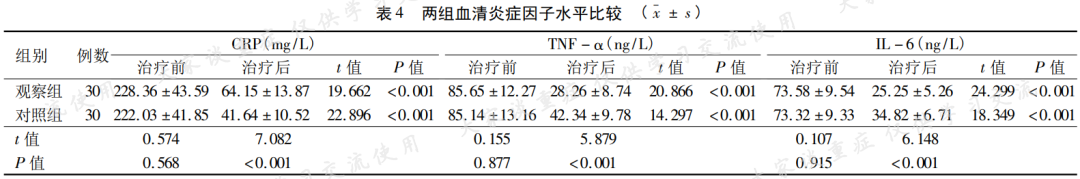 研 究 报 道 如 下01一般资料02治疗方法02观察指标03结果 观察组临床总有效率为90.00%,显著高于对照组(70.00%),组间比较差异有统计学意义(P<0.05)。02中医证候积分、BISAP评分及MCTSI评分 治疗前,两组血清CRP、TNF-α、IL-6水平比较,差异均无统计学意义(P>0.05);治疗后,两组血清CRP、TNF-α、IL-6水平均较治疗前明显降低,差异均有统计学意义(P<0.05);且观察组血清CRP、TNF-α、IL-6水平均显著低于对照组,差异均有统计学意义(P<0.05)。 治疗前,两组呼吸功能、肝功能、肾功能及心肌酶指标比较差异均无统计学意义(P>0.05;治疗后,两组PaO2、PaO2/FiO2均较治疗前明显提高,血清AST、ALT、肌酐、尿素、肌酸激酶、LDH水平则均较治疗前明显降低,差异均有统计学意义(P<0.05);且与对照组相比,观察组PaO2、PaO2/FiO2均更高,血清AST、ALT、肌酐、尿素、肌酸激酶、LDH水平则更低,组间比较差异均有统计学意义(P<0.05)。04讨论05结论